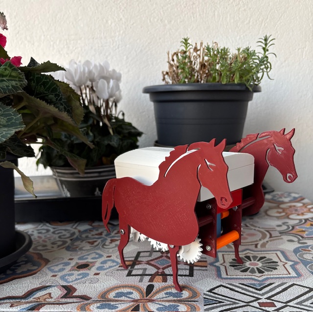 Voici l’installation, on remarque le moteur, les engrenages, les jambes et le cheval.
